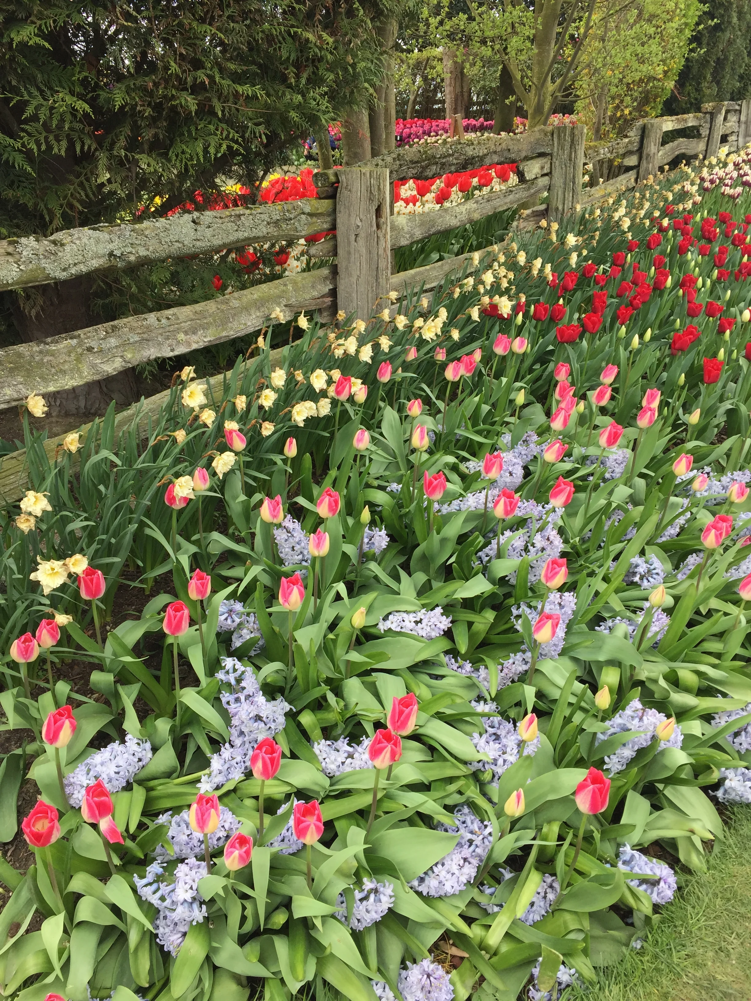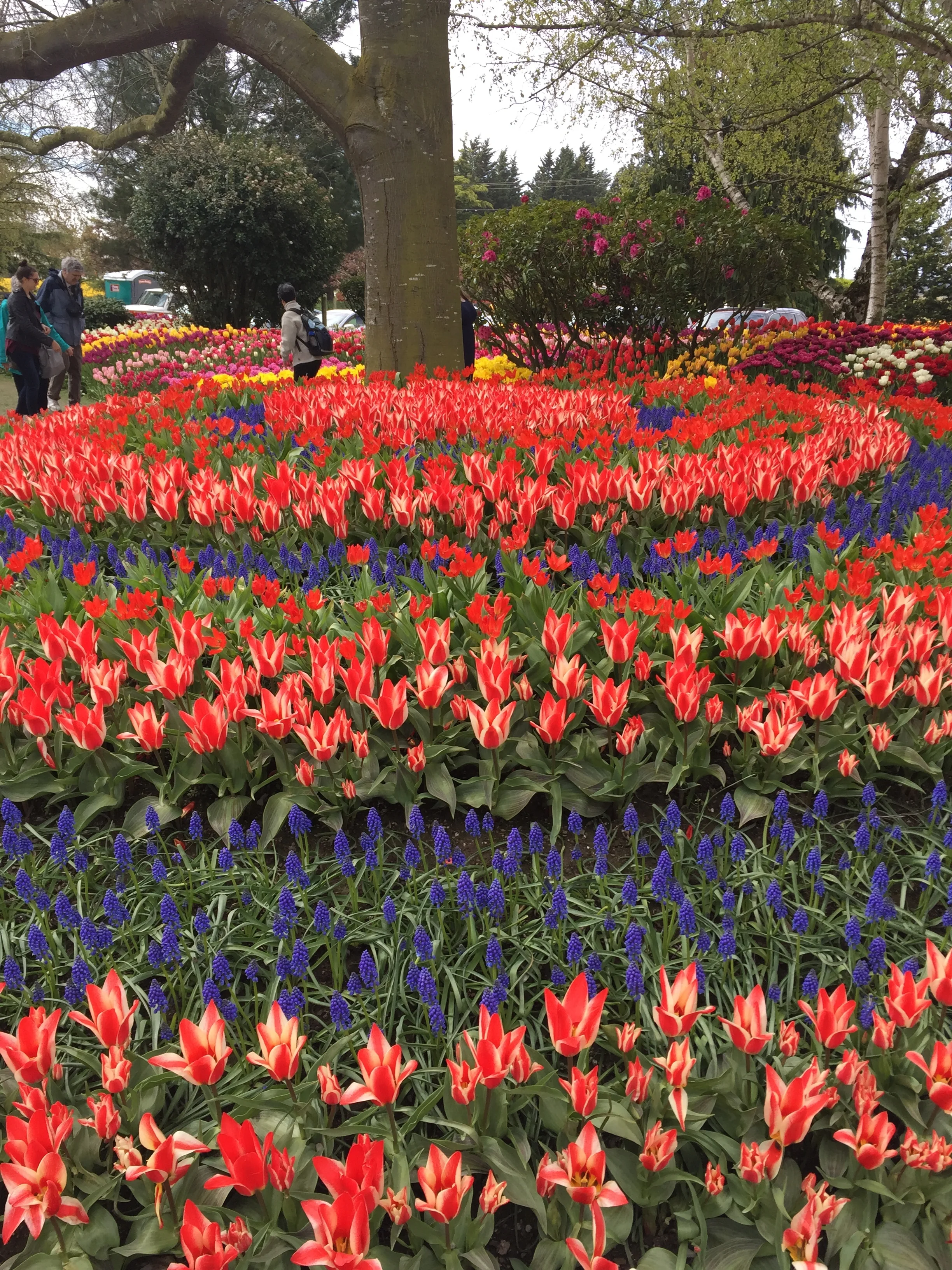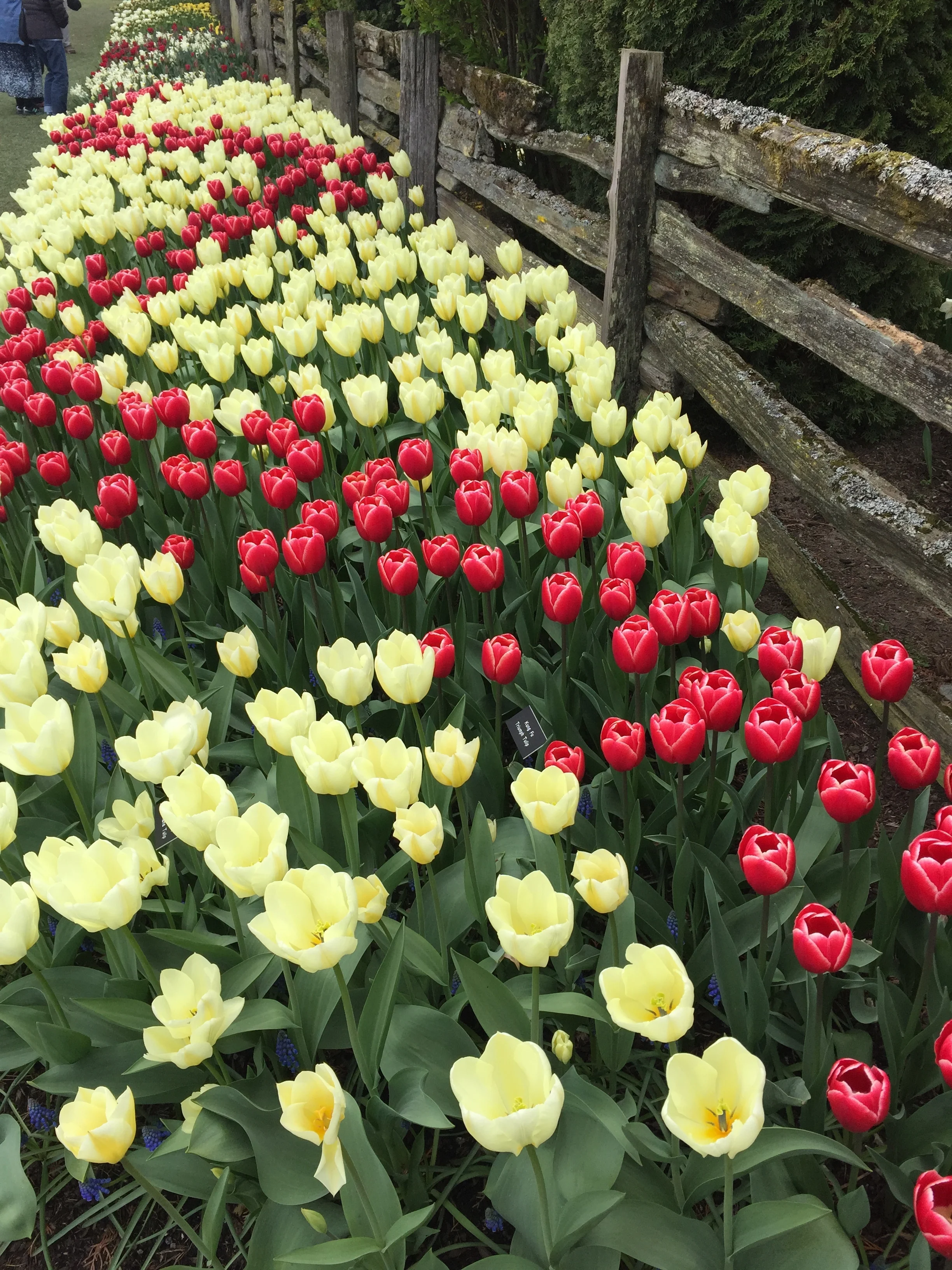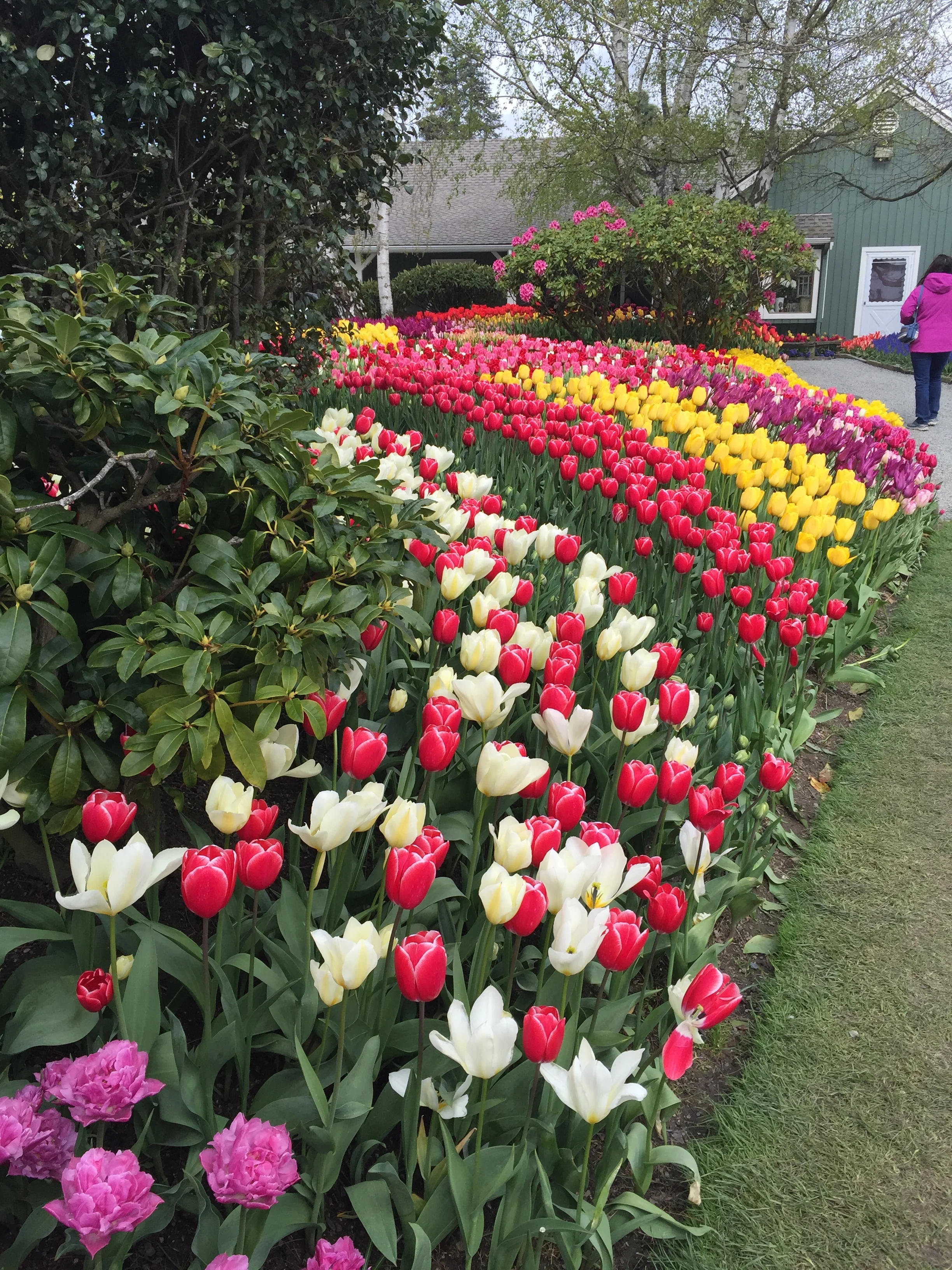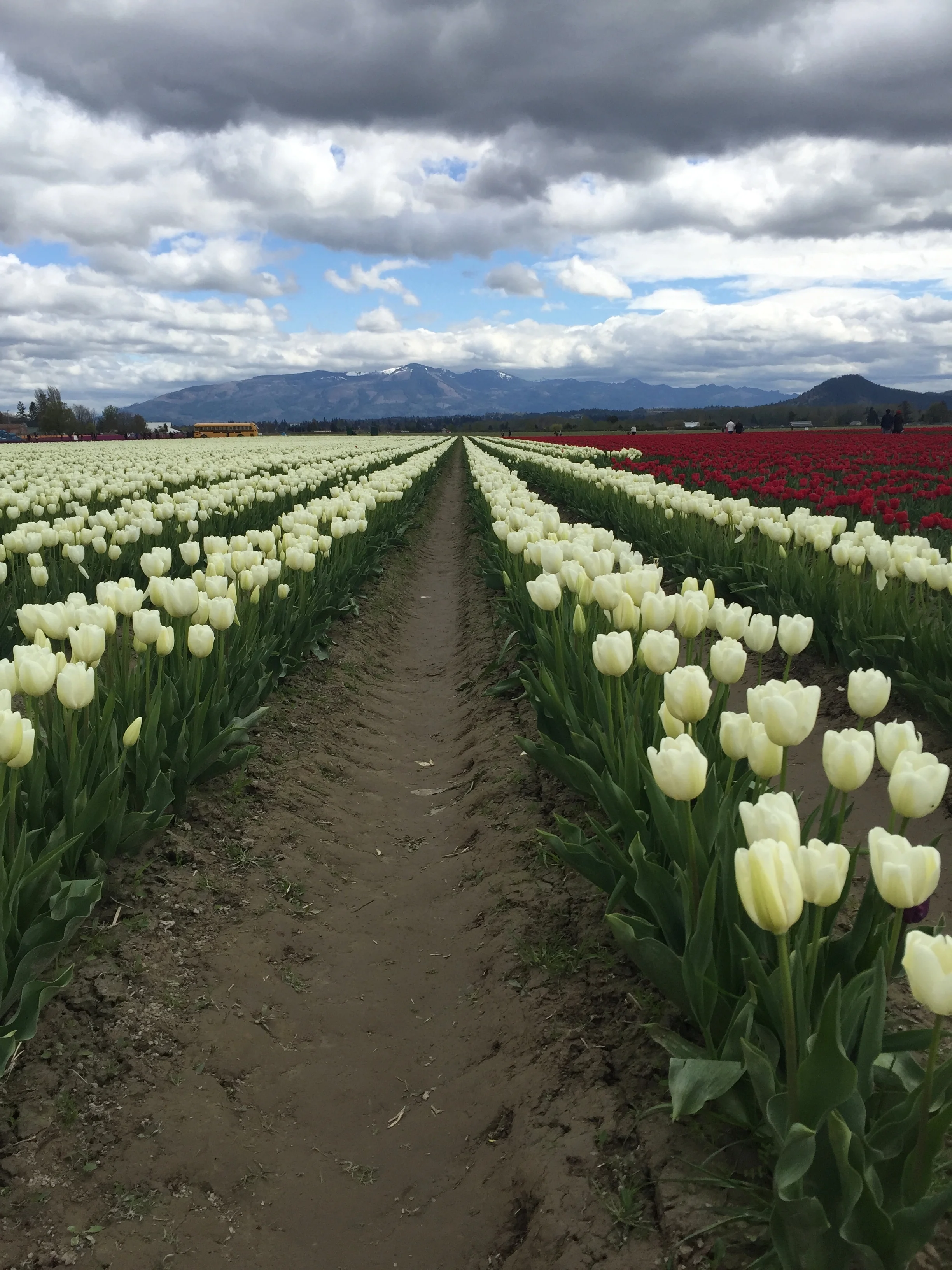There are basically two options for visiting the tulip fields near Mt Vernon...Tulip Town or Roozengaarde. Tulip Town has the big massive fields, with rows and rows of tulips and Roozengaarde has the lovely tulip gardens that flow around the grounds with a few large fields as well. We choose to go to Roozengarde and were not disappointed, even though the dark clouds were ominous, dimming the brightness of the fields.